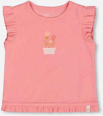 Our Rib Tank Top with Frills Coral Pink is a must-have for little girls with an ultra-sweet sense of style. Frilled accents at each armhole offer a bit more coverage than the typical tank, while a ribbed texture and a round neckline make it incredibly comfortable to wear. A graphic print on the chest and frills around the hem add the perfect finishing touches!