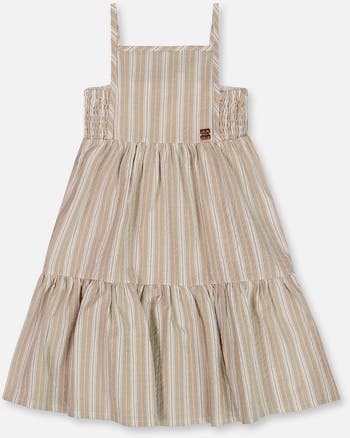 In lightweight cotton fabric, our Sleeveless Linen Dress White and Sage Striped is perfect for parties, play days, and family outings. This comfy, casual dress features adjustable spaghetti straps, a square neck bodice, stretch smocked panels for all day comfort, and a tiered A-line silhouette. A small metal logo plate adds a touch of signature style.