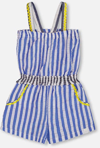 Contrast ricrac trim adds a bright pop of color to our Sleeveless Seersucker Romper Blue and White Striped. With a contrasting striped waistband and contrast striped straps, this one-piece features a square neckline, an elastic waist that makes it super comfy to wear, and scoop front pockets. It's a perfectly playful look for any spring or summer day!