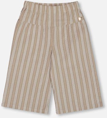 Little Girl's Wide Leg Capri Linen Pant White And Sage Striped