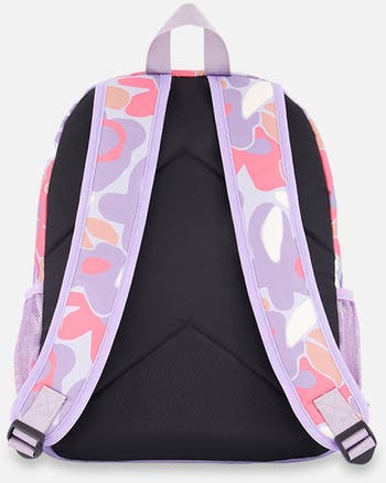 Sized for toddlers heading to preschool or daycare, this eco-friendly lilac retro flower print knapsack is cute, colorful, and oh-so-comfortable for little ones to carry. In oxford fabric made from recycled plastic bottles, this backpack includes three compartments of different sizes plus a water bottle pocket, a padded back panel, and adjustable waist and shoulder straps.