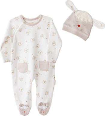 Soft, snuggly, and irresistibly sweet—this cozy duo brings gentle charm to naptime and playtime alike. White footed with scattered sheep faces, red dot accents, and contrast pockets for added texture. Enclosed feet with sheep face details and snap closures for easy changes. Matching hat with floppy ears and fluffy top completes the look with playful personality.