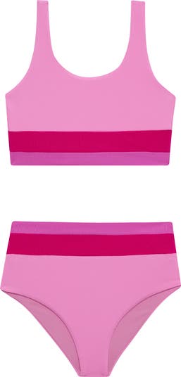 This bright colorblocked two-piece swimsuit is made from ultrasoft ribbed fabric and cut with an on-trend high waist for your stylish one.