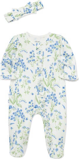 Bluebells look sweet on a soft cotton footie with with plenty of ruffles, a quick front-zip closure and matching headband.