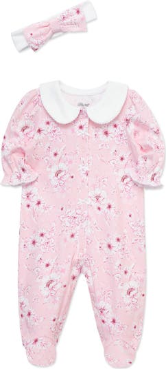 A rose toile print looks darling on a soft cotton footie with a Peter Pan collar, a snap closure and a bow-accented headband.