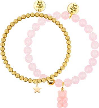 Elevate her jewelry collection with this sophisticated and dainty 2-piece bracelet set from Little Miss Zoe. This perfectly paired duo features one slender gold-plated bracelet and one delicate gemstone beaded bracelet accented with a signature charm. Proudly crafted in California, this set offers a refined, lightweight feel that is perfect for everyday elegance or special occasions. Features & Details: Dainty Duo: Includes two bracelets designed for a minimalist, layered look, one classic gold-plated and one hand-beaded gemstone strand. Semi-Precious Sparkle: The beaded bracelet is crafted with gemstones, known for their natural beauty and soft color. Artisan Quality: Hand-assembled in California with premium materials, ensuring a delicate look that is still durable enough for daily wear. Adjustable Fit: Both bracelets are designed with little wrists in mind, featuring secure closures and extenders to grow with her. Gift-Ready: Arrives in our signature gift pouch, making it a thoughtful keepsake for flower girls, birthdays, or graduations. Specifications: Set Includes: 1 Dainty Gold-Plated Bracelet, 1 Gemstone Beaded Bracelet. Materials: 14K Gold Plating, Semi-Precious Gemstones. Origin: Crafted in California, USA.