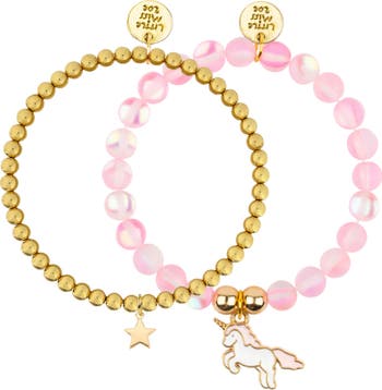 Elevate her jewelry collection with this sophisticated and dainty 2-piece bracelet set from Little Miss Zoe. This perfectly paired duo features one slender gold-plated bracelet and one delicate glass moonstone beaded bracelet accented with a signature charm. Proudly crafted in California, this set offers a refined, lightweight feel and a magical glow that is perfect for everyday elegance or special occasions. Features & Details: Dainty Duo: Includes two bracelets designed for a minimalist, layered look, one classic gold-plated strand and one hand-beaded glass moonstone strand. Luminous Moonstone Glow: The beaded bracelet is crafted with high-quality glass moonstones, celebrated for their iridescent shimmer and light-catching beauty. Artisan Quality: Hand-assembled in California with premium materials, ensuring a delicate look that is still durable enough for daily wear. Adjustable Fit: Both bracelets are designed with little wrists in mind, featuring secure closures and extenders to grow with her. Gift-Ready: Arrives in our signature soft gift pouch, making it a thoughtful keepsake for flower girls, birthdays, or graduations. Specifications: Set Includes: 1 Dainty Gold-Plated Bracelet, 1 Glass Moonstone Beaded Bracelet. Materials: 14K Gold Plated Brass, Iridescent Glass Moonstones. Origin: Crafted in California, USA. Safety: Lead-free and Nickel-free.