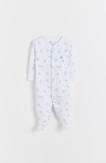 Printed Pima cotton footie with a leg and long sleeves, and snaps across the front from the neck to the feet. Made of soft Pima cotton.