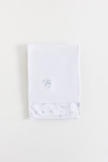 Pima cotton blanket, made of soft cotton for gentle contact with baby's skin. It features a print on one side, and a plain Pima cotton blanket with a signature embroidery on one end. Measuring approximately 73 x 69 cm, it's perfect for covering or swaddling your baby, providing extra comfort and warmth. A practical and cozy option for caring for and protecting your baby at all times.