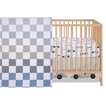 Get ready to hit the track with our Little Racer Baby Crib Bedding Set. This 3-piece baby bedding set includes one comfy blanket, one breathable 100% cotton fitted crib sheet, and one decorative crib skirt. The warm and cozy blanket has a soft minky front and a luxurious white faux shearling back. The checkered front is a combination of blue, gray, taupe, and white. The white faux shearling back is oh so soft and cuddly. The breathable 100% cotton fitted crib sheet is on a clean white ground with colorful race cars and checkered flags. There is elastic all the way around ensuring a safe and secure fit on a standard size crib or toddler mattress. The crib skirt adds the finishing touch to your child’s crib. The skirt is a cotton poly blend with cute race cars in multiple colors along with black and white checkered flags. It has a 14 ½” drop which hides most of the crib hardware.
