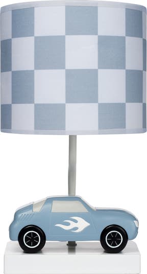 This custom, hand-painted resin lamp will provide a soft glow in your child’s room. The race car has blue with white racing stripes across the top and white flames on both doors. The windows are gray, tires are black, and headlights and tail lights are white. The blue and white checkered lamp shade is 6” high and 7” in diameter. Total height of the lamp with shade is 13 ½”. The lamp comes complete with an energy-efficient light bulb.