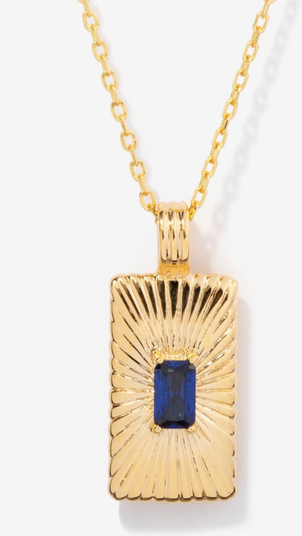 Meet your new everyday statement. The Sunburst Sapphire Clara Pendant Necklace features a radiant sunburst-inspired gold pendant centered with a deep blue sapphire-tone gemstone. Perfect for layering or wearing solo.