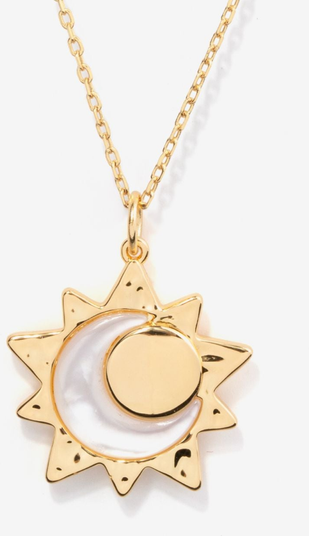 A celestial moment, captured in gold. The Eclipse Charm Necklace features a radiant sunburst silhouette embracing a luminous crescent of mother-of-pearl, symbolizing balance, transformation, and new beginnings. The contrast of soft iridescence and polished gold creates a striking yet wearable statement.