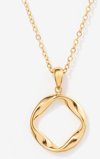 A modern symbol of continuity and connection. The Twisted Infinity Circle Necklace features a softly sculpted open circle with a fluid, twisted design—representing infinite movement, balance, and enduring bonds. Finished in polished gold, its organic shape catches the light beautifully while remaining effortlessly minimal.