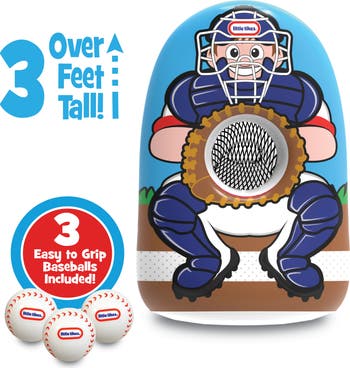 The Little Tikes Jumbo Baseball Trainer is a great way for your little champ to develop the proper technique for throwing strikes. This Baseball Trainer is fun for the whole family to experience and join in on the baseball action. Just add a bat and mitt and you will have a full baseball game in your very own home! Pretty soon your little champ will begin to throw with accuracy and speed and possibly one day be the next future MLB All-Star! Includes one (1) 3ft trainer and three (3) baseballs. Inflate the trainer, fill base with sand or water to balance and have fun! Perfect for ages 3 to 6 years old and encourages active play. Helps children develop their balance and hand-eye coordination while practicing their pitching skills. Adult assembly required, easy setup and storage. If water is used to balance the trainer, make sure base is fully empty and dry before storing. Not for children under 3 years of age. Outdoor use only! Use on clean flat surface free of any debris or sharp objects. Easy to clean material wipe with damp cloth. Pump not included. Additional items shown on box are not included. WARNING: CHOKING HAZARD -- Small parts.
