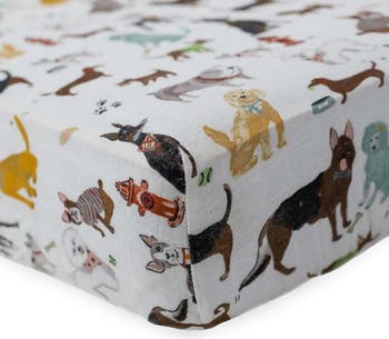 A playfully printed fitted crib sheet made of lightweight and breathable cotton muslin feels soft against baby's skin and is made in an open weave that dries quickly.