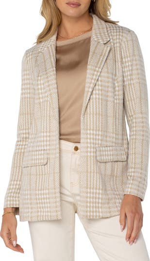 Done in a sophisticated plaid, this open-front blazer is made from stretch-knit fabric in a relaxed fit for day-to-night comfort.