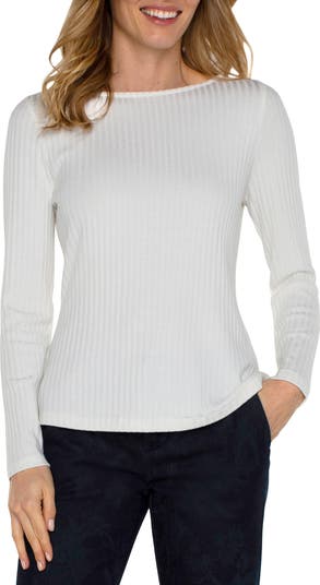 A boat neckline gracefully finishes this top cut from a stretchy knit with flat ribbing that encourage its figure-skimming fit.