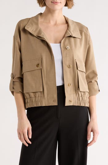 Go from casual days to fun nights out in this stretch-woven jacket featuring a covered button placket, roomy cargo pockets and a partially elasticized hem.