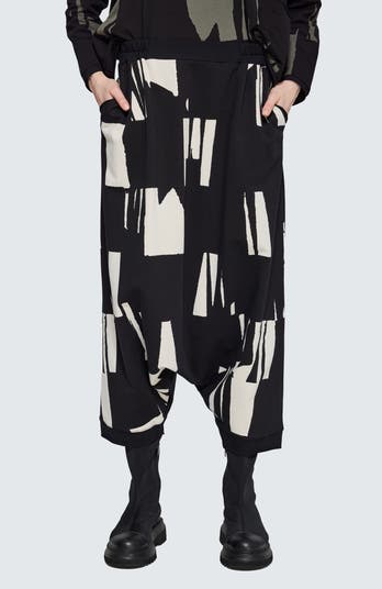 7/8 length printed cotton jersey balloon pants with a tapered leg, elastic waistband, and cropped hem for a sculptural yet relaxed silhouette.