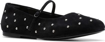 Polished studs highlight the supple suede exterior and bring an edgy aesthetic to a mary jane ballet flat set on a cushioned footbed and durable rubber sole.