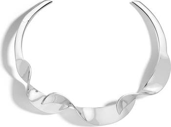 A ribbon-like effect gives graceful movement to this silvery statement necklace that wows on its own or in a layered style.