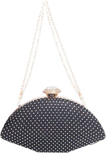 - Elegant fan-shaped evening clutch with subtle rhinestone embellishment I Removable chain strap for clutch or shoulder wear I Perfect for weddings, galas, cocktail parties, and formal events