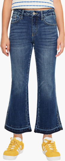 Enhance your outfit with this dark wash cropped flare jeans. The jeans feature a side slit detail, one-button closure, and five-pocket design.