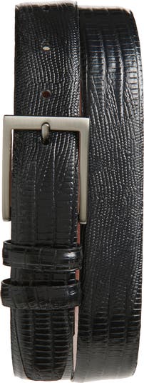 Brushed hardware fastens this versatile belt made from fine calfskin leather stamped with an intriguing lizard-textured pattern.