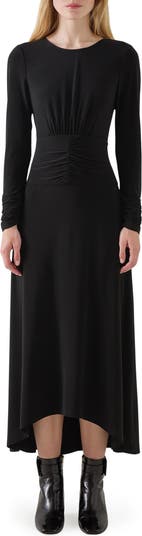 Rippled ruching shapes this figure-skimming maxi crafted from soft stretch jersey and punctuated with a drapey high/low skirt for graceful movement.