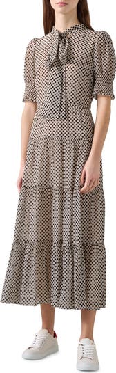 Puff sleeves and a graceful tie at the neck lend retro style to a tiered maxi dress cut from flowy fabric.