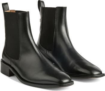 A slender toe silhouette updates the look of this supple calfskin bootie subtly branded at the back shaft by goldtone logo hardware.