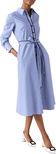 Contrast trim heightens the crisp, classic style of this impeccably striped long-sleeve shirtdress.