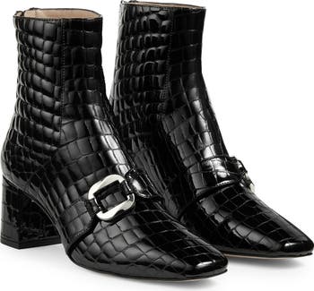 This striking block-heel bootie with patent croc embossing brings stylish edge to your everyday wardrobe.