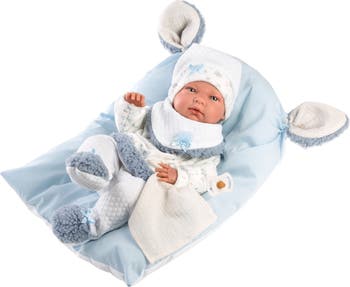 This beautifully detailed baby doll is dressed in an adorable fleece one-piece with a matching cushion that has a built-in mobile. An included pacifier teaches little ones to soothe and exercise nurturing skills.