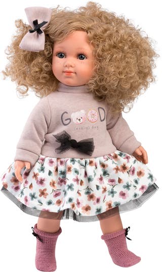 This beautifully detailed doll is ready for a day around town in a graphic sweatshirt, floral skirt and booties accented with black ribbons. Made with moveable joints, this doll encourages children as they develop their nurturing and self-help skills.