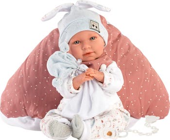 This beautifully detailed baby doll with an articulated body is dressed in a cozy bear-patterned jumpsuit and a marled beanie with adorable bunny ears. Faith cries three times and says 'mama' and 'papa' but she is able to suck her pacifier or snuggle with her mushroom cushion to calm down. Made with movable joints, this doll sparks the imaginations of children as they develop nurturing and self-help skills.
