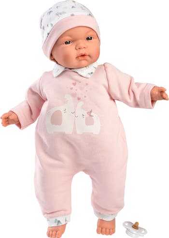 This beautifully detailed baby doll is dressed in an adorable collared one-piece and includes a bitty pacifier and matching hat.