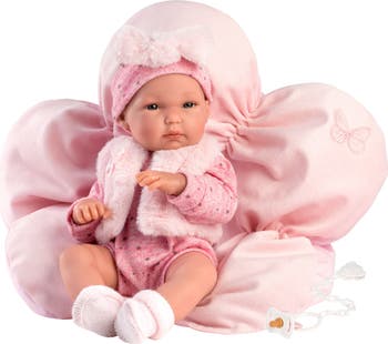 This beautifully detailed baby doll is dressed in an adorable knit one-piece with a matching flower-shaped cushion. An included pacifier teaches little ones to soothe and exercise nurturing skills.