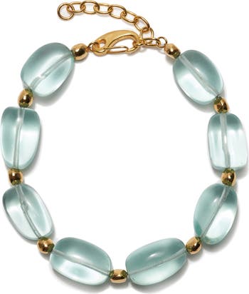 Dreamy aqua-blue glass beads and gold-plated baubles line this collar necklace, bringing rich color and shine to your look.