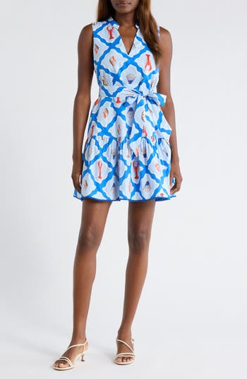 A tie belt defines the waist of this sleeveless poplin mini covered in a sea-inspired print and finished with a flouncy frilled hem.
