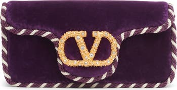 This playful clutch that's crafted from purple velvet with rope trim showcases a '90s-inspired baguette silhouette and crystal-encrusted VLOGO hardware. A chain strap and tasseled rope strap—both detachable—offer carrying options for the covetable look.