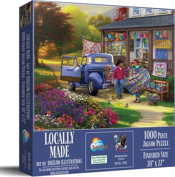 Immerse yourself in the wonder of Americana with the SunsOut "Locally Made" 1000 piece jigsaw puzzle. Exploding with nostalgic charm, this remarkable 20" x 27" puzzle showcases licensed artwork from Bigelow Illustrations that encapsulates rural beauty and community spirit across the American landscape. Proudly crafted in the U.S. using high-quality recycled cardboard, each puzzle piece interlocks perfectly, providing a robust and secure assembly, all housed in a vibrant display box that teases the masterpiece you're about to create. SunsOut is renowned for its dedication to eco-responsibility, utilizing soy-based inks and recycled materials for a greener puzzling experience that doesn't compromise on enjoyment. The puzzles from homegrown brand SunsOut capture the true spirit of the USA and embrace the company's commitment to superior craftsmanship, placing customer satisfaction at the heart of their operations with a guarantee to resolve any issues with missing or damaged pieces. Dive into the stunning artwork of Bigelow Illustrations, where vibrant colors and meticulous detail paint an authentic picture of life in the countryside – a celebration of culture and artistry. SunsOut proudly identifies as a woman-owned small business, contributing to the diversity of the marketplace. By choosing the "Locally Made" puzzle, you are not only indulging in a premium entertainment experience but also supporting female entrepreneurship and the relentless passion devoted to every SunsOut creation. Enjoy the craftsmanship, appreciate the art, and savor the satisfaction of supporting a woman-led business with the SunsOut "Locally Made" puzzle.