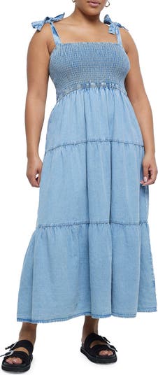 Elaborate smocking defines the bodice of a swingy denim sundress accented with cute ties at the straps.