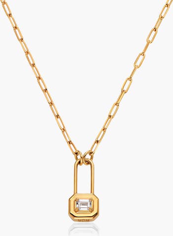 Crafted in gold vermeil, this charm features a 30-point, emerald-cut Moissanite stone (4.5X3.2mm). It can be personalized and engraved, making it a thoughtful and timeless gift or keepsake. Gold Vermeil: Gold vermeil provides that lux look you love at a great price. This piece has a thick layer of 18K gold (up to 5 times more than regular plating) over 925 sterling silver. Moissanite Stone information: Total Carat Weight: 0.3ct Moissanite, a natural silicon carbide, has become a popular diamond alternative. With its durability and captivating brilliance, this gemstone is now primarily lab-grown, promoting responsible sourcing. With exceptional hardness, second only to diamonds, moissanite is a captivating and practical choice for exquisite jewelry. Explore more of our beautiful collection of Lock Necklaces & Jewelry—perfect for treating yourself or giving a meaningful gift to someone special.