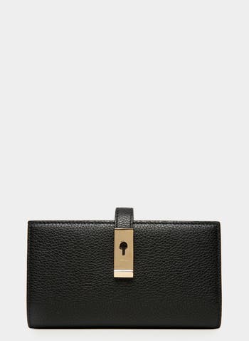 In supple grained calfskin, this Lock Me long wallet has multiple compartments and a snapped strap with gold-tone metal Lock Me hardware.