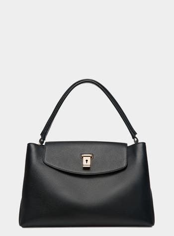 This Lock Me top handle bag is crafted from black grained leather into a structured silhouette. The namesake clasp in gold-tone metal trims the flap closure of the central compartment. A variety of carry options - hand, shoulder and crossbody - are ensured by the wide drop handle and the detachable strap.