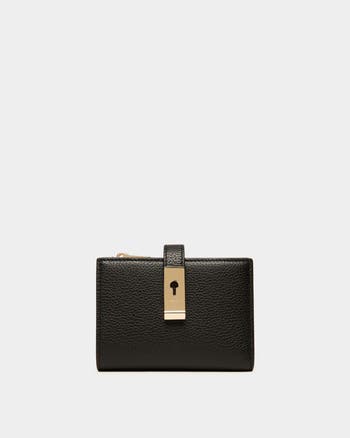 In grained calfskin, this Lock Me wallet comes in a bifold design. The strap closure is secured by a snap button, embellished by the Lock Me hardware in gold-tone metal.