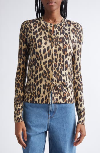 Leopard spots lend fierce appeal to this wardrobe-staple cardigan knit from fine-gauge wool.