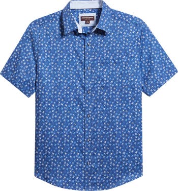 Johnston & Murphy Logan Airplane Print Short Sleeve Cotton Blend Button-Up Shirt, Main, color, Navy Flight Paths